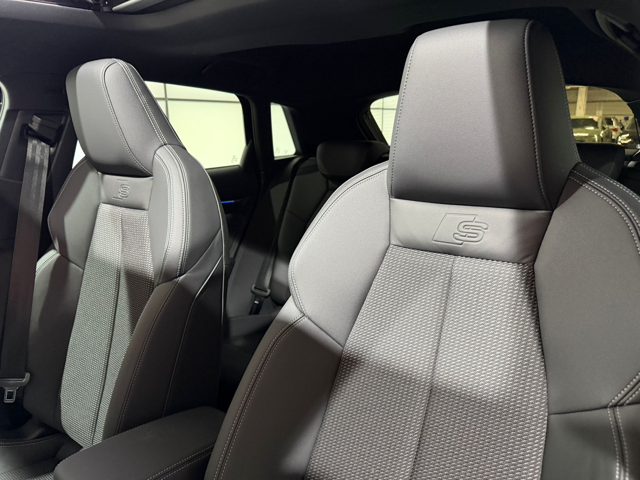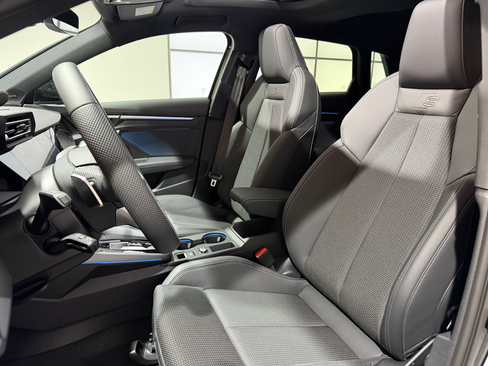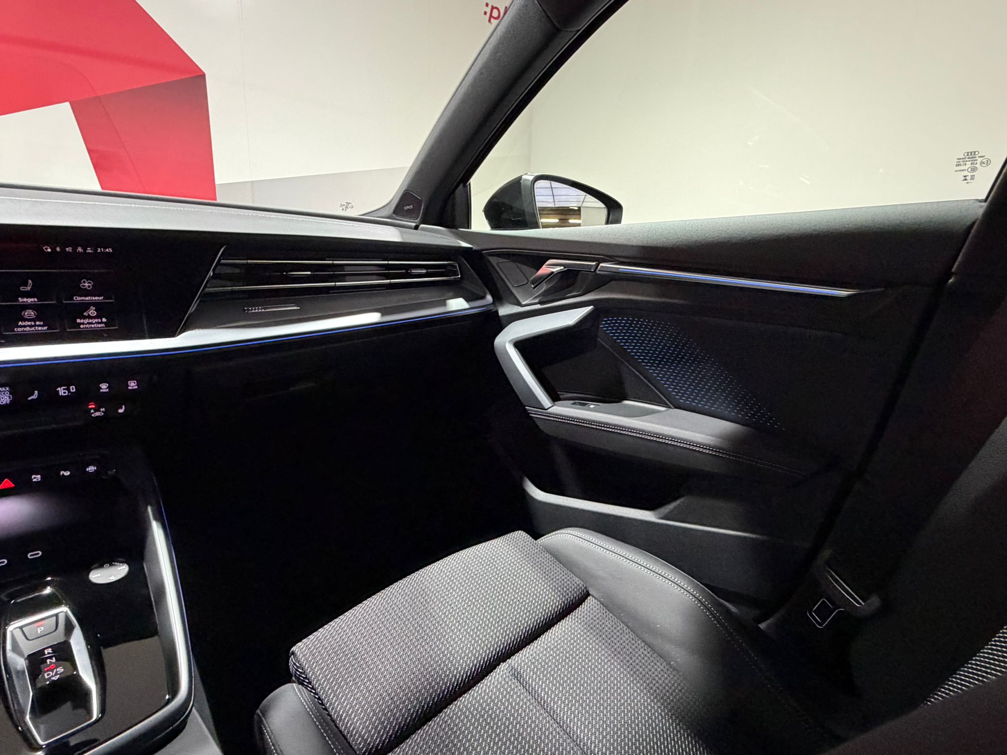Pack intérieur S line 1 Sièges sport à l'AV, Sellerie en combinaison tissu Pouls/similicuir avec estampagne S, Pédalier en acier inoxydable, Enjoliveurs de seuil de porte avec inserts en aluminium à l'AV, Dossier de banquette AR rabattable 60/40, Application de volant en style chrome, emblème S, poignées de volant en cuir perforé et couture contrastée, Pavillon en tissu noir, Accoudoir en matériaux synthétiques, Style aluminium à l'intérieur