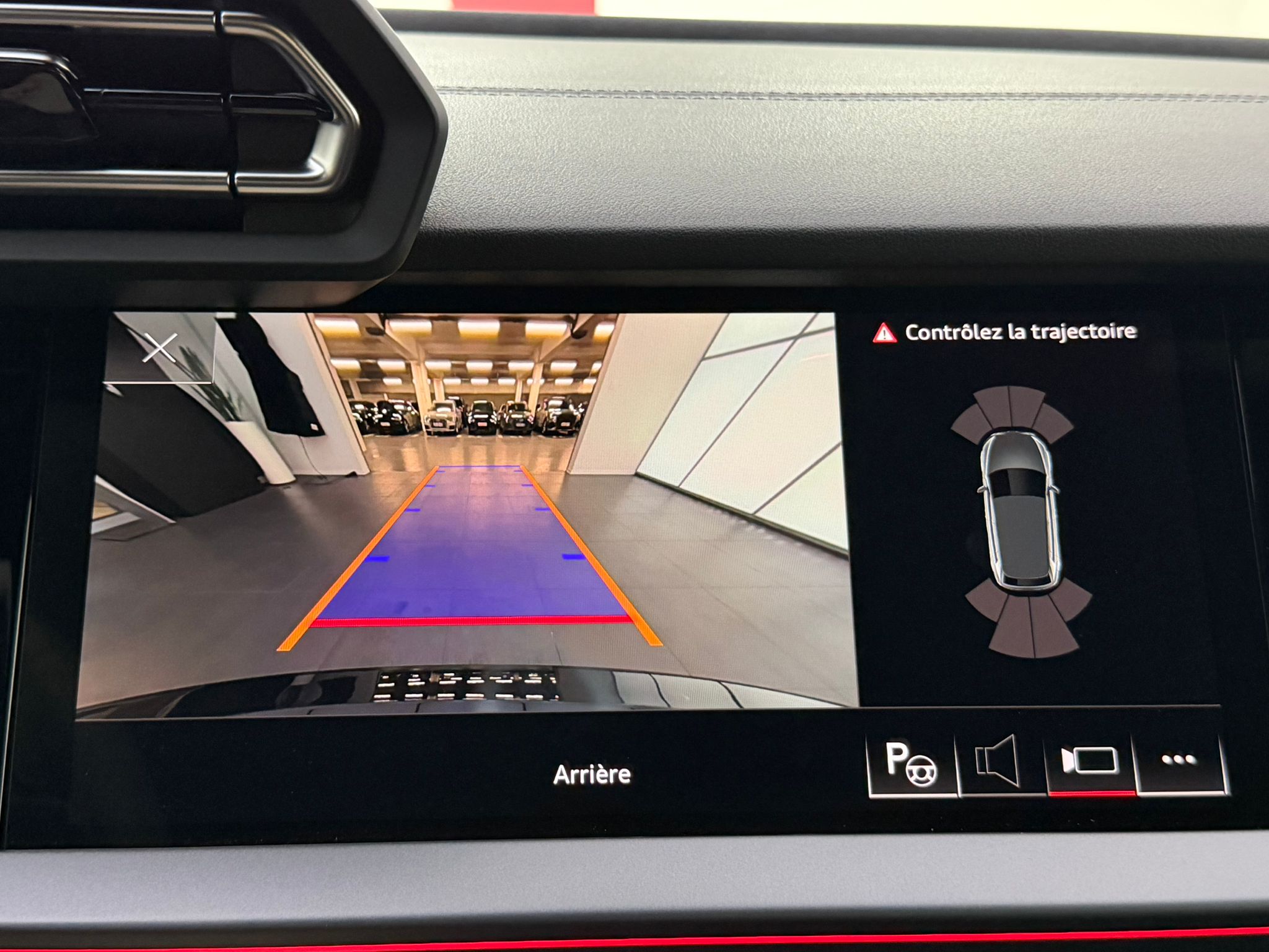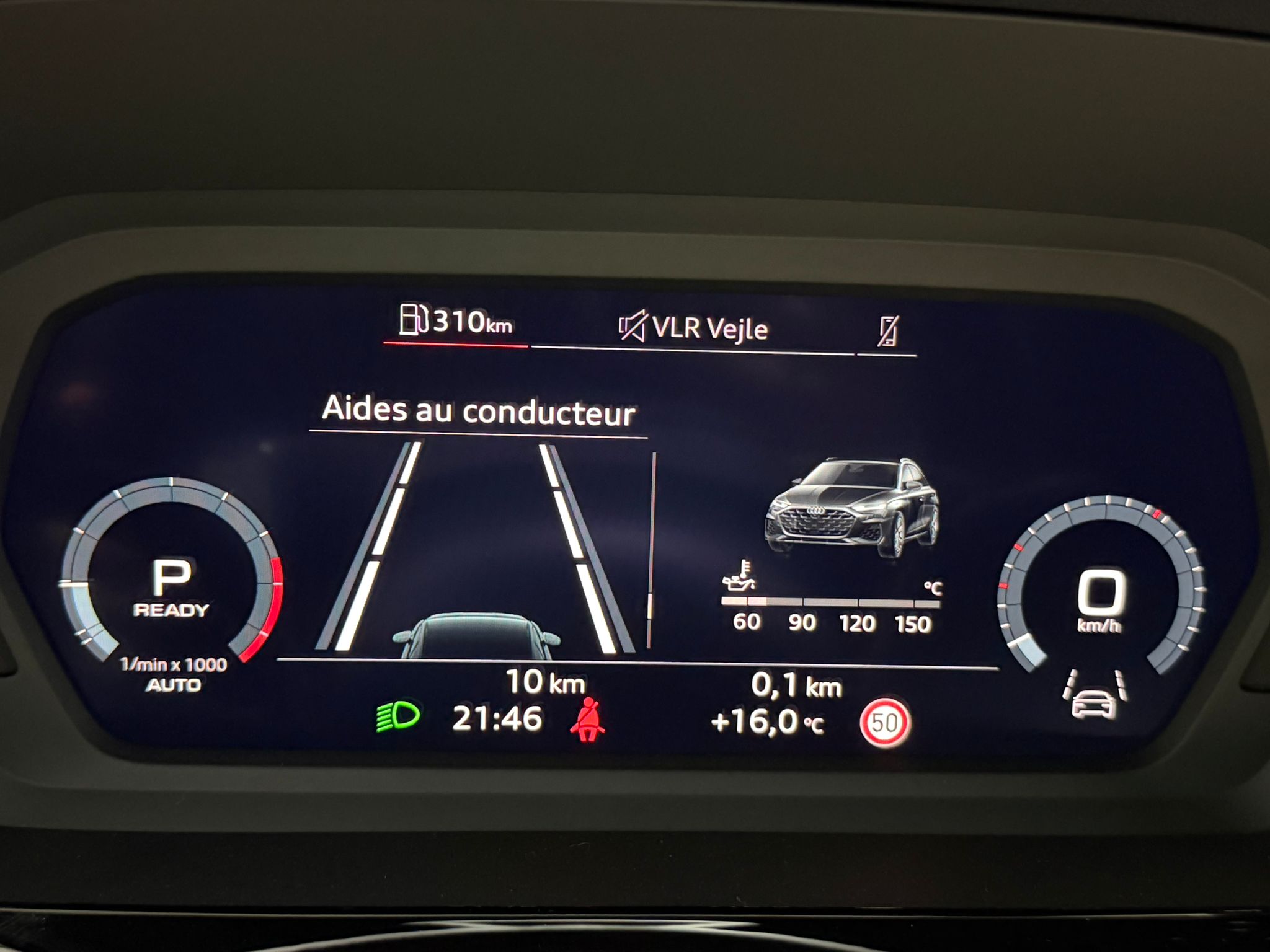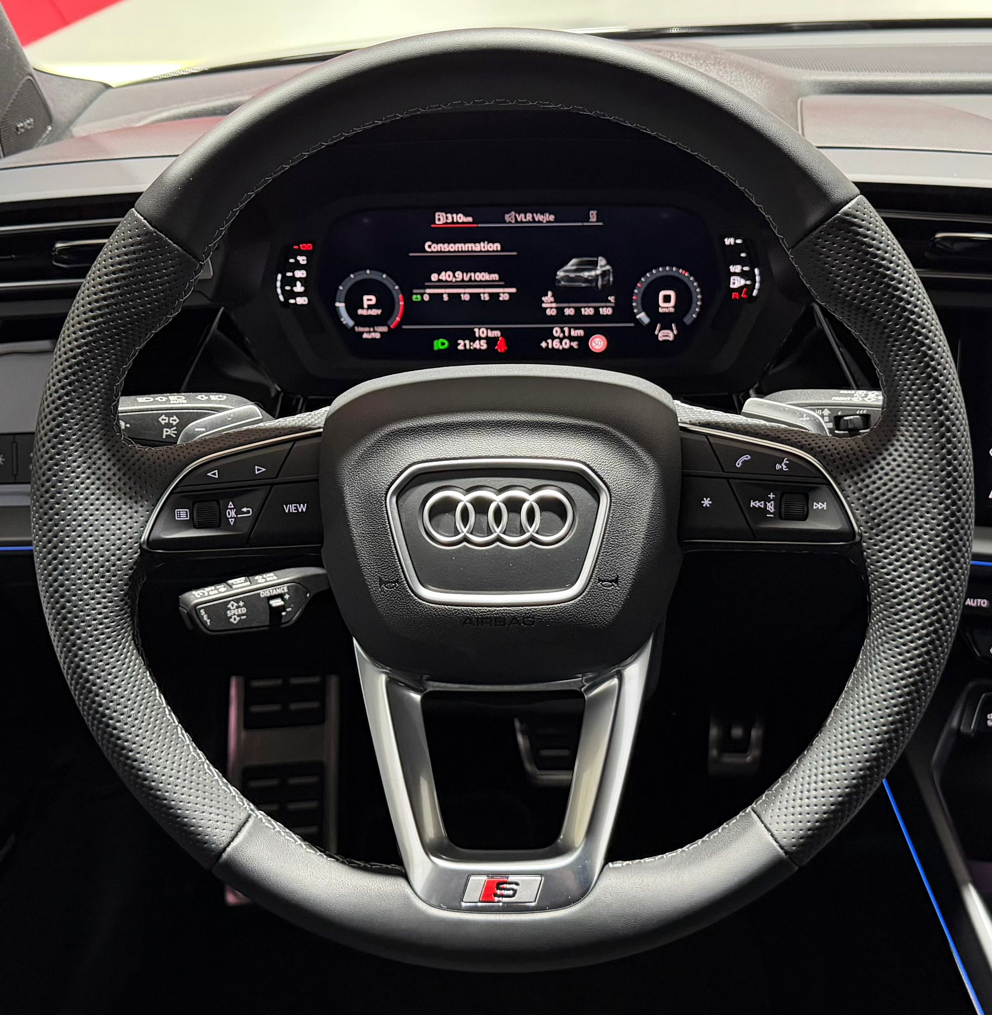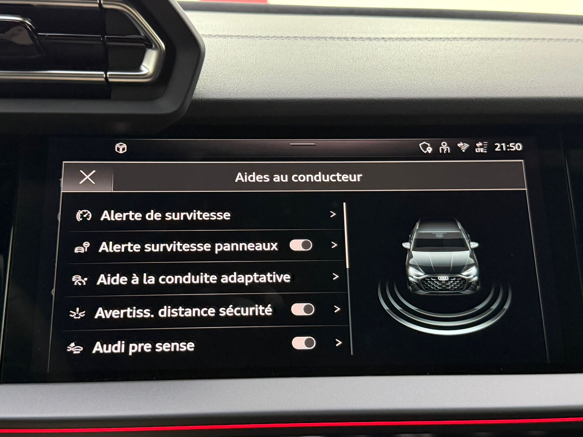 Pack assistance route - Régulateur de vitesse adaptatif avec assistance d'urgence et contrôle prédictif - Reconnaissance des panneaux de signalisation par caméra - Park assist plus avec système de stationnement avec affichage à 360 - Assistance latérale avec alerte de sortie et assistance au trafic transversal AR - Aide à l'embardée et aide au virage - Audi pre sense basic et Audi pre sense rear