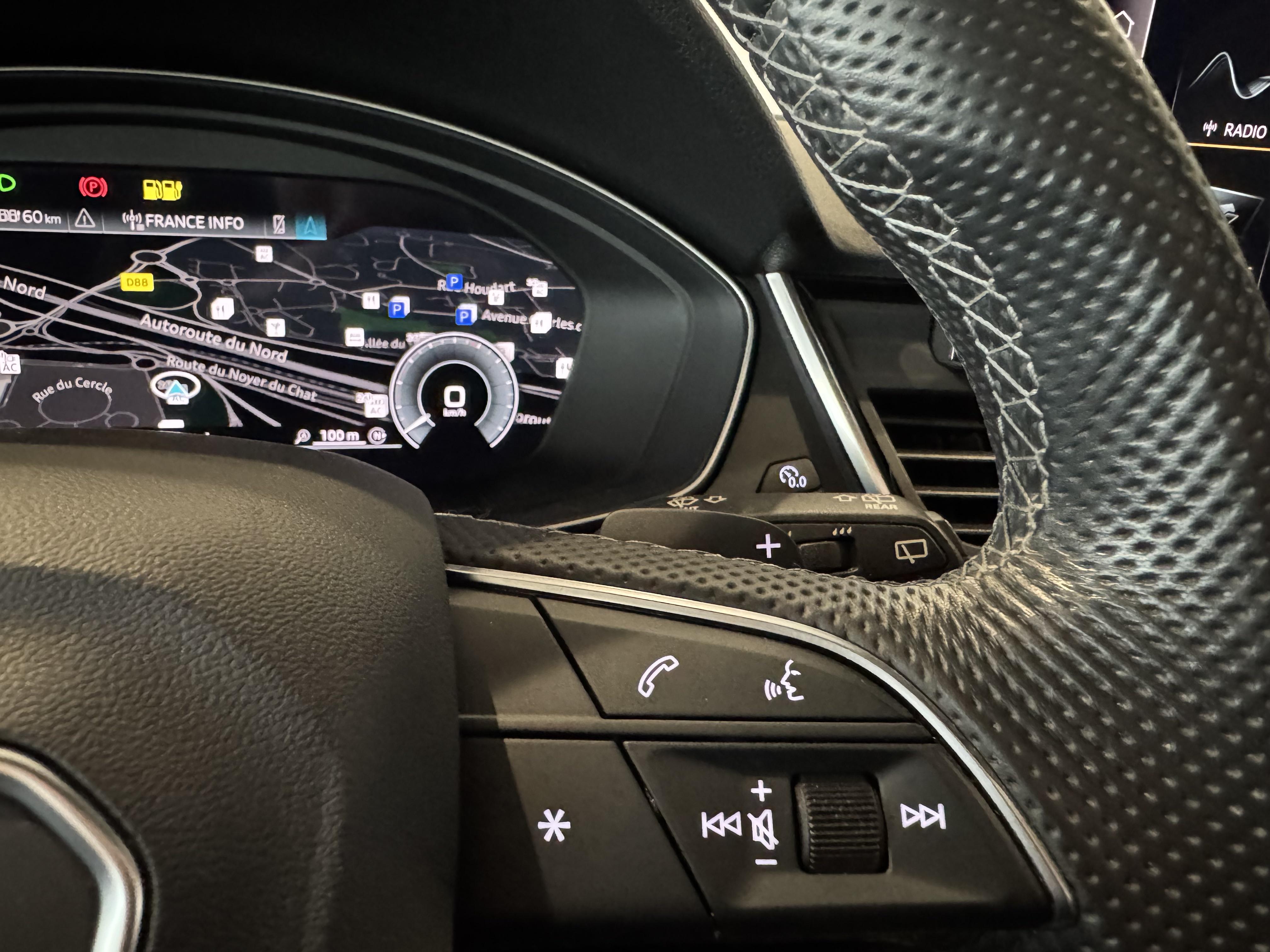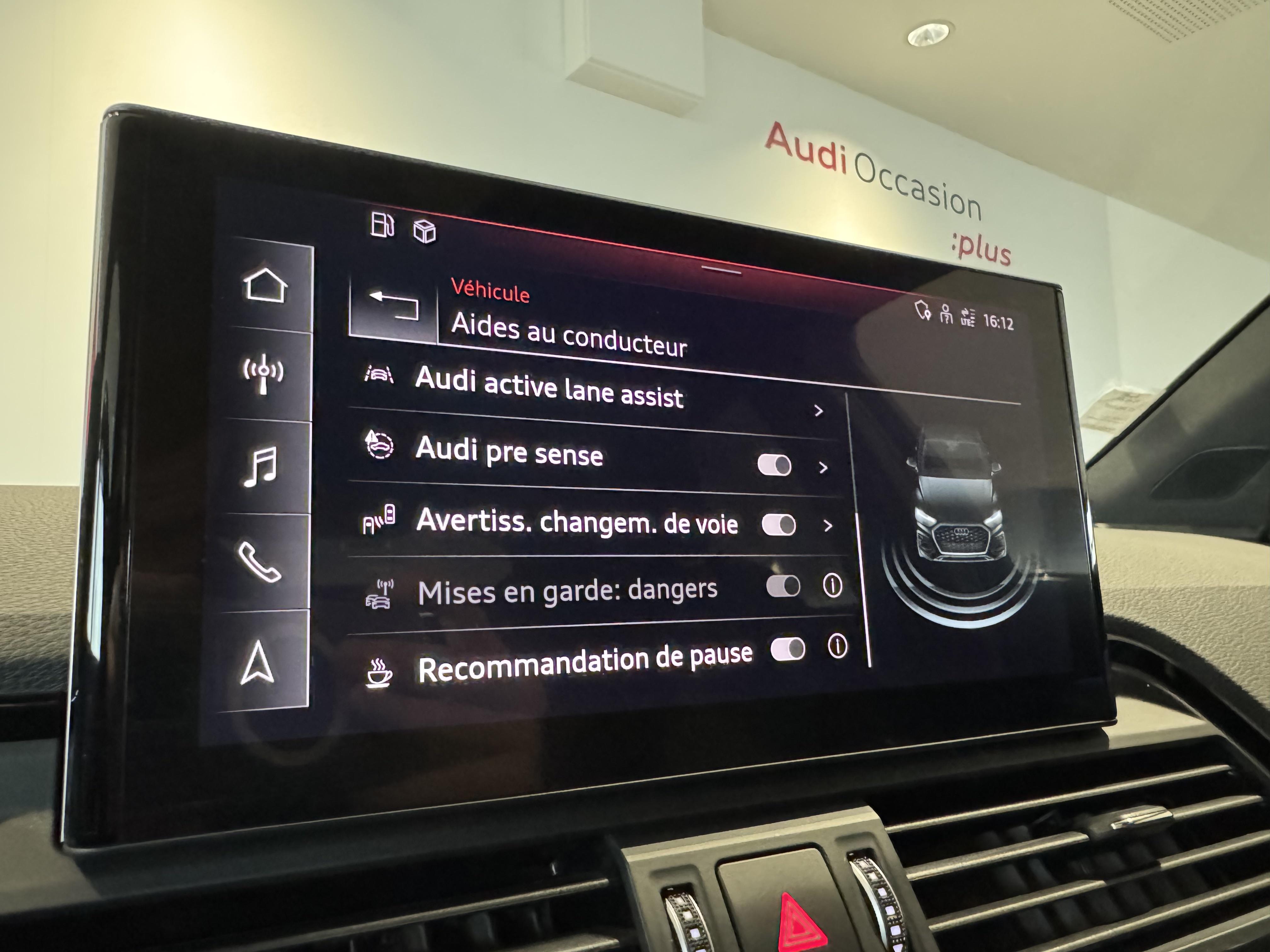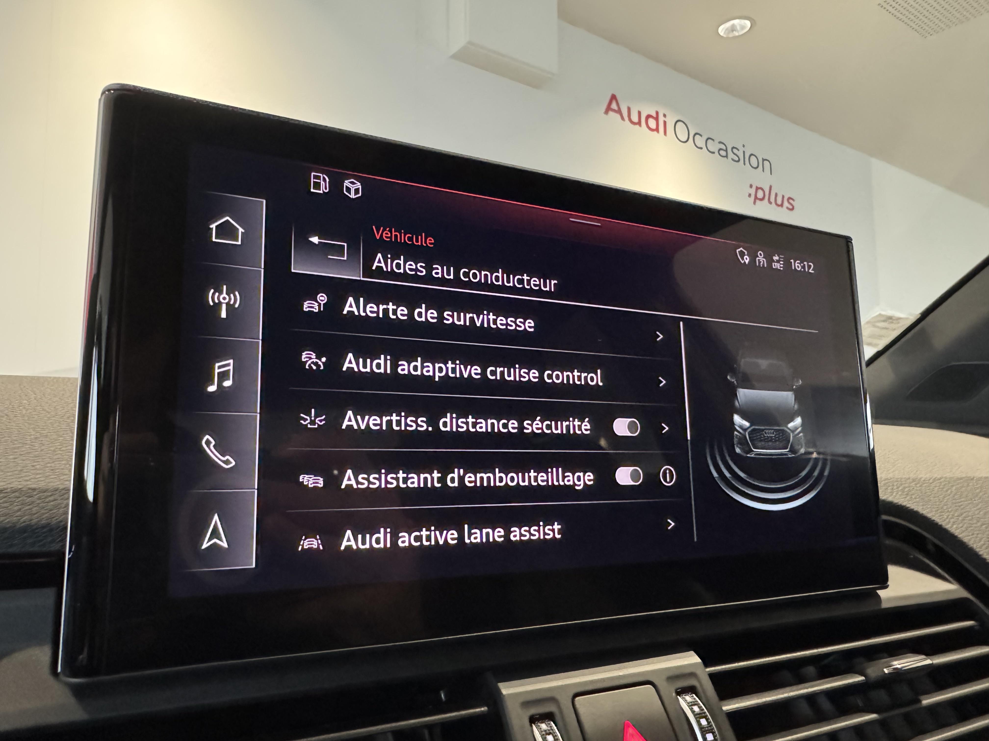 Pack Assistance Route - Adaptive cruise control incluant fonction Stop&Go avec assistant de conduite en embouteillage - Assistant d'efficacité prédictive - Audi pre sense front incluant assistant d'évitement d'urgence et assistant de changement de direction - Audi active lane assist