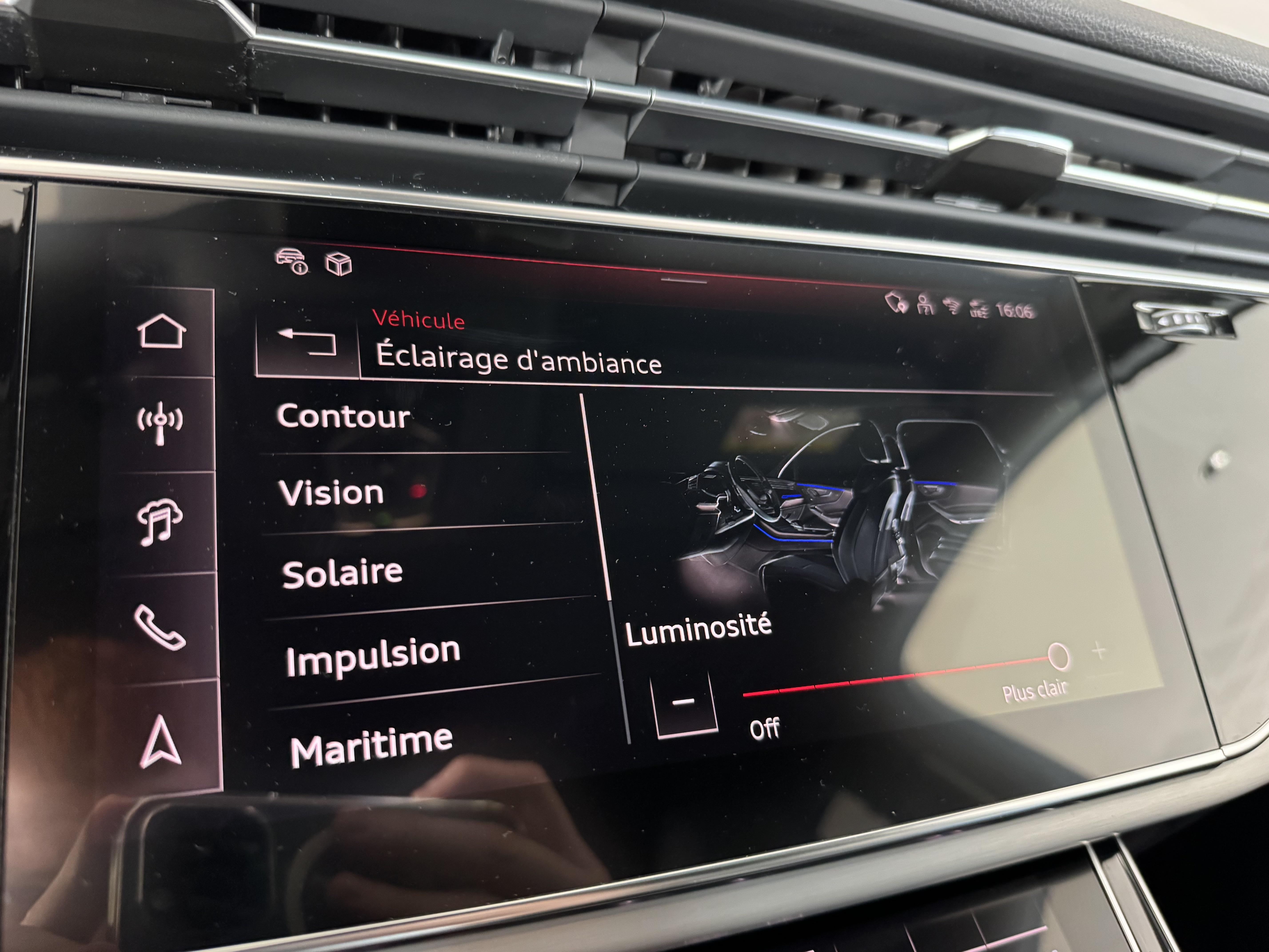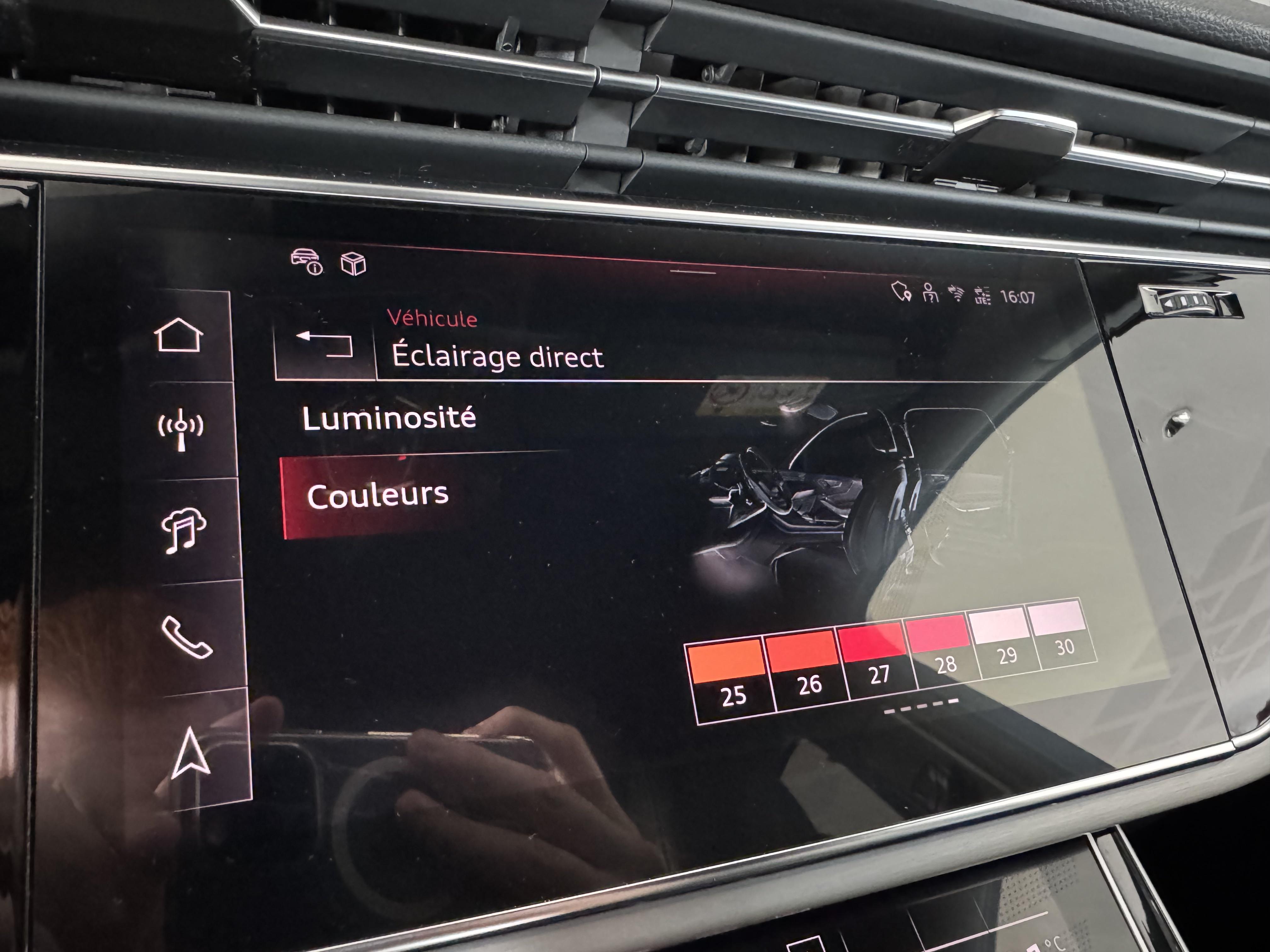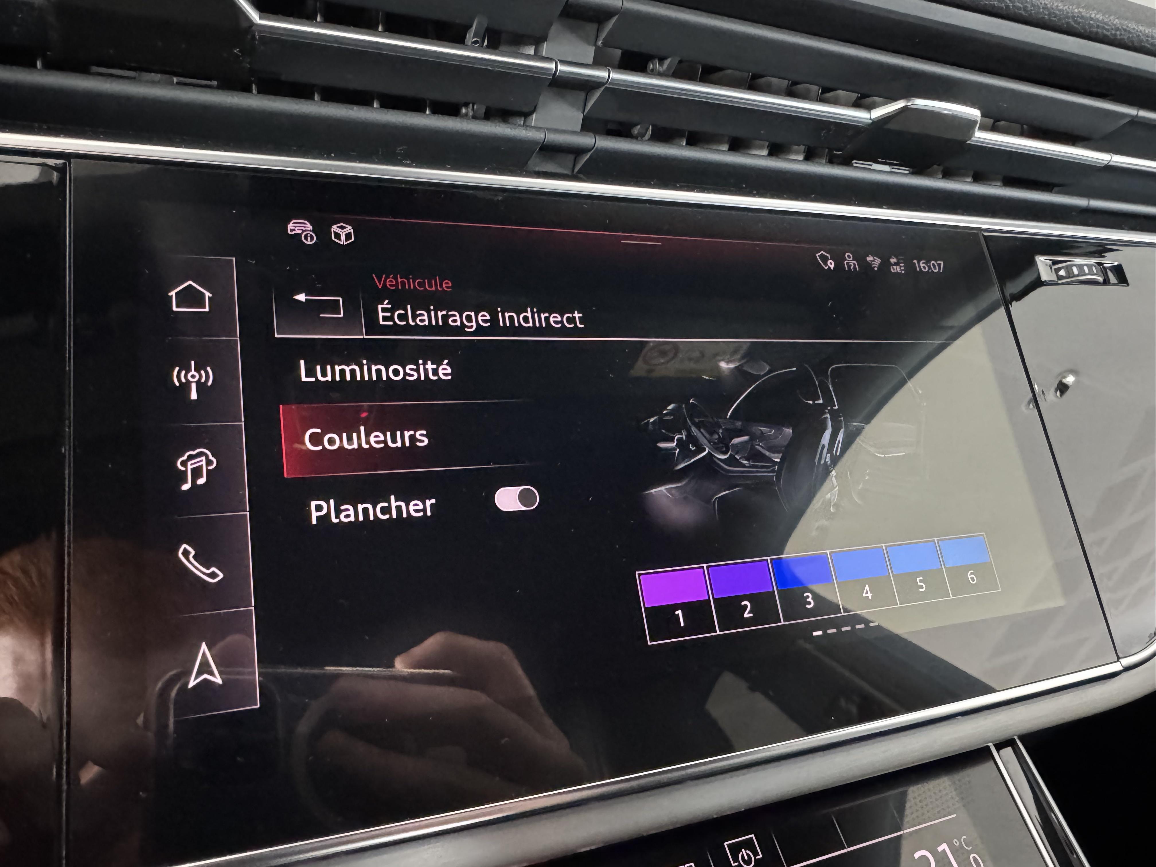 Pack Éclairage Ambiance LED multicolore 6 profils de couleur prédéfinis, 1 profil de couleur supplémentaire. interactif et personnalisable parmi une gamme de 30 couleurs, Réglage séparé des teintes luminéuses de contours et d'ambiance, Éclairage des zones suivantes: vide-poches de portières AV/AR, contour des portières avant/arrière, tissu des portières AV/AR, console centrale à l’AV, contour de la console centrale AV, Éclairage de contour avec inscription quattro éclairée, Éclairage d’ambiance du tableau de bord